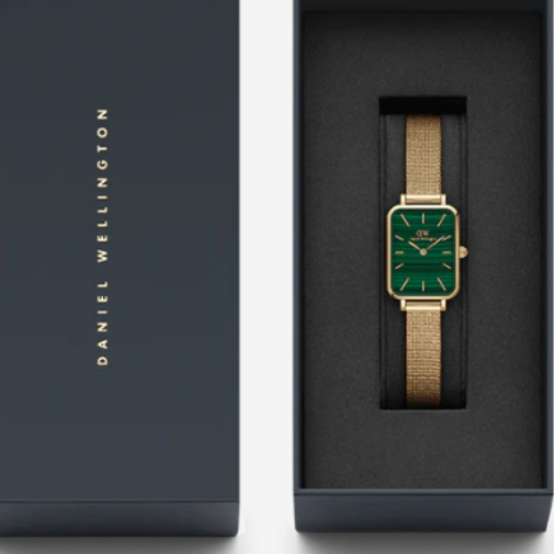 The Quadro Pressed Evergold introduces a stronger visual edge to the Daniel Wellington wrist watch collection, with its striking square dial in deep green. The combination of sharp geometry and rich tone gives this piece a bolder identity. The dial is paired with a shimmering gold mesh strap, crafted to mimic a fabric-like texture that feels soft against the skin. Every element is considered, from the 6mm thin case to the delicate 10mm strap width.