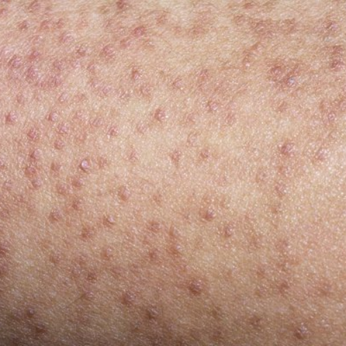 KP happens when keratin (a natural protein that protects the skin) builds up and blocks hair follicles. Instead of shedding normally, keratin forms tiny plugs under the skin. This leads to the rough texture and small red or white bumps people often describe as “strawberry skin,” which somewhat looks like this: