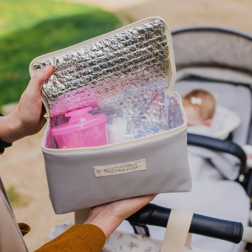The outside is stylish and waterproof, while the inside layer works like a thermos to hold temperature. It even has a handy little spike-stitch handle that makes it easy to carry wherever the day takes you, and your baby.