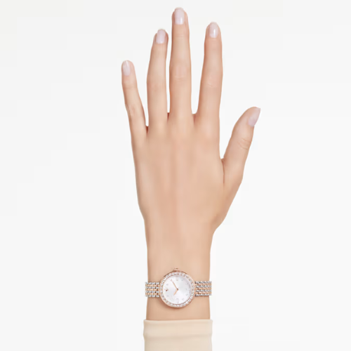 This Swarovski crystal watch brings an effortless polish to your wrist, drawing inspiration from the Matrix jewelry line. Its 30mm stainless steel case holds a glitter-infused dial marked with minimalist hour markers, slender hands, and the iconic Swarovski swan at the 12 o’clock spot. A bezel adorned with 42 crystals frames the face beautifully, while an additional crystal set into the crown adds extra dimension.