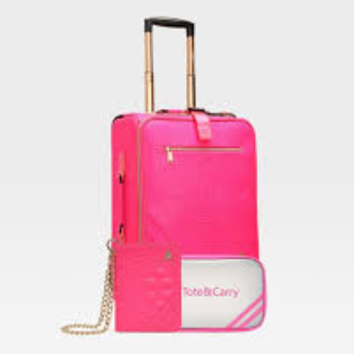 For travelers who never shy from the spotlight, the Apollo 2 Voyager Travel Set in Neon Pink delivers an unapologetically bold look. This three-piece combo from tote and carry includes a compact rolling suitcase, a structured toiletry bag, and a coordinating wallet, each wrapped in a luxe faux crocodile finish that turns heads without trying. The neon pink hue is pure energy, matched only by the sleek golden hardware that adds a polished edge. While the aesthetic packs a punch, this set holds its ground in performance, too.