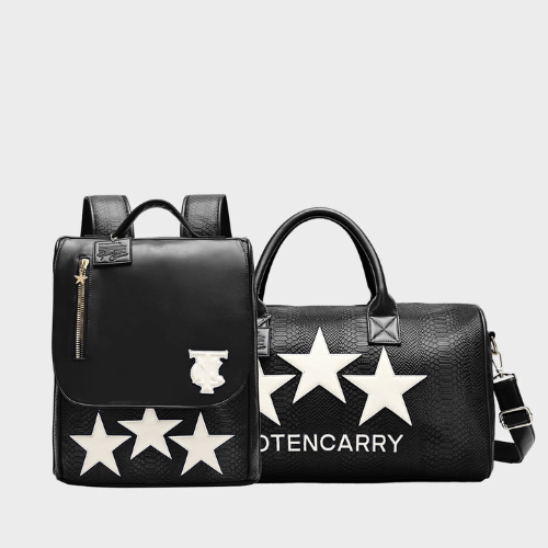 Designed to be seen, The Superstar Travel Set in Black doesn’t just accompany you, it leads the way. This two-piece design from tote and carry features a coordinated backpack and duffle set marked by bold white stars across a jet-black faux snakeskin exterior. The pattern is equal parts striking and streamlined, ideal for those who want their travel look to reflect personality without excess. Each bag is detailed with metallic hardware, structured handles, and practical interior layouts that hold everything with ease.
