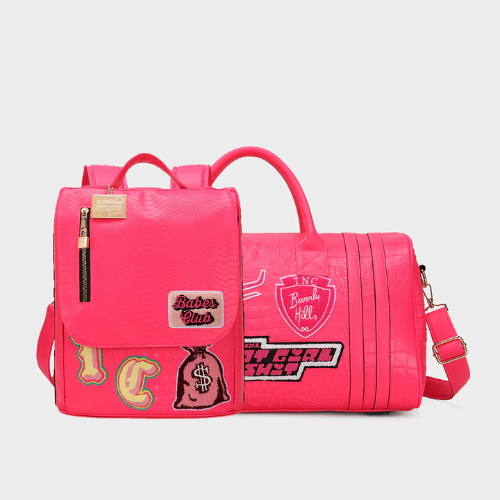 Bold doesn’t even begin to cover it. The Baddie Exclusive Travel Set in Neon Pink redefines standout travel style with its mix of fun, fearless design, and smart utility. Featuring a backpack and matching duffle, this two-piece set feels curated for those who live loud and love the details. The vibrant neon pink is paired with mixed textures, think faux snakeskin and croc embossing, while embroidered patches like “Babes Club” and playful icons bring an extra layer of personality.