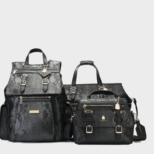 Sleek, commanding, and built with intention, the Viper Travel Set in Black is a lesson in quiet luxury. Designed by tote and carry for discerning travelers, this premium suite includes multiple pieces, duffles, crossbodies, and backpacks, all cloaked in richly embossed black faux snakeskin. The effect is subtle but powerful, elevated even further by refined gold-tone hardware that plays beautifully against the texture. With a price tag of $1,200.00, this collection speaks to longevity.